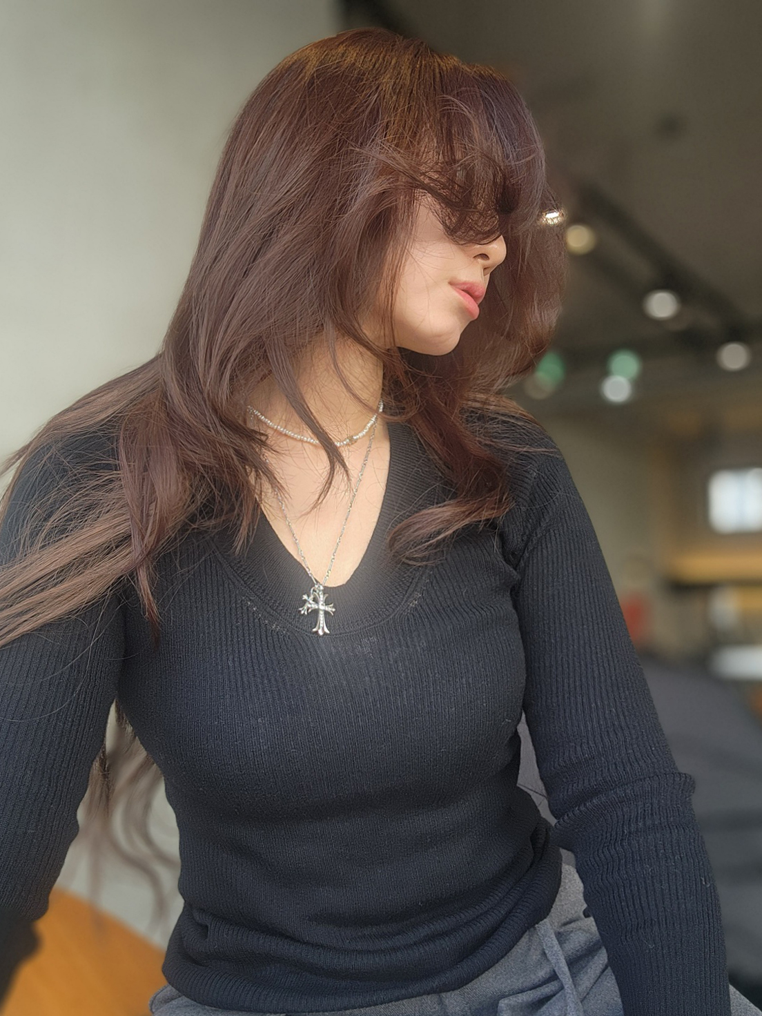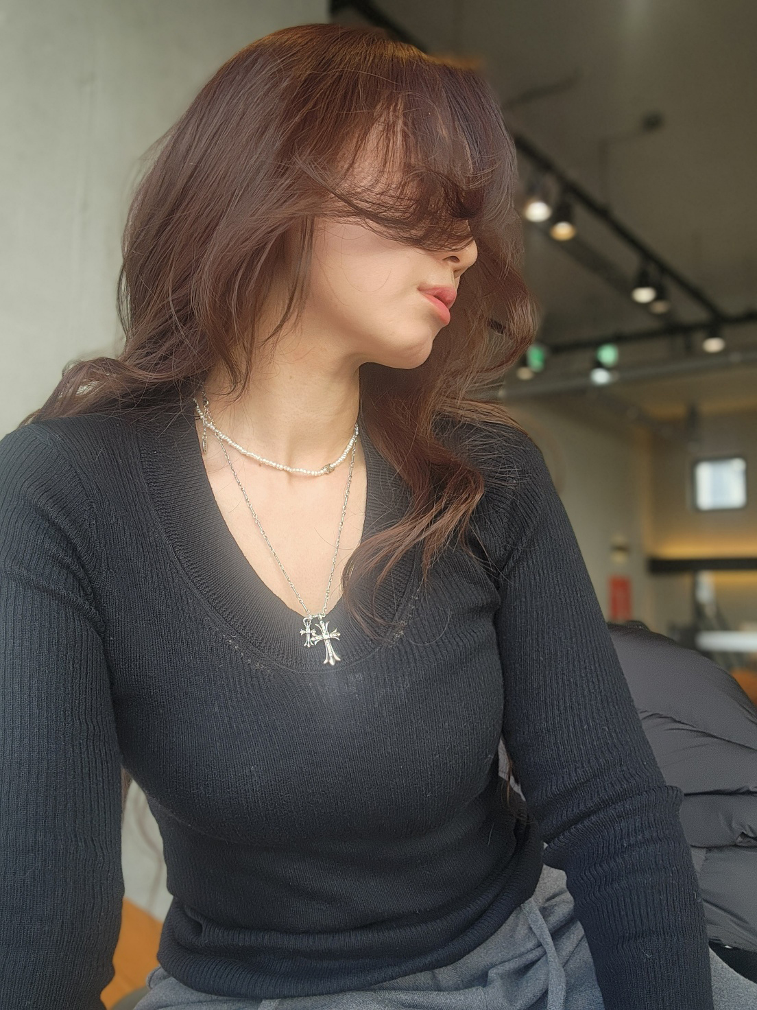 쇄골과 넥 라인이 자연스럽게 드러나